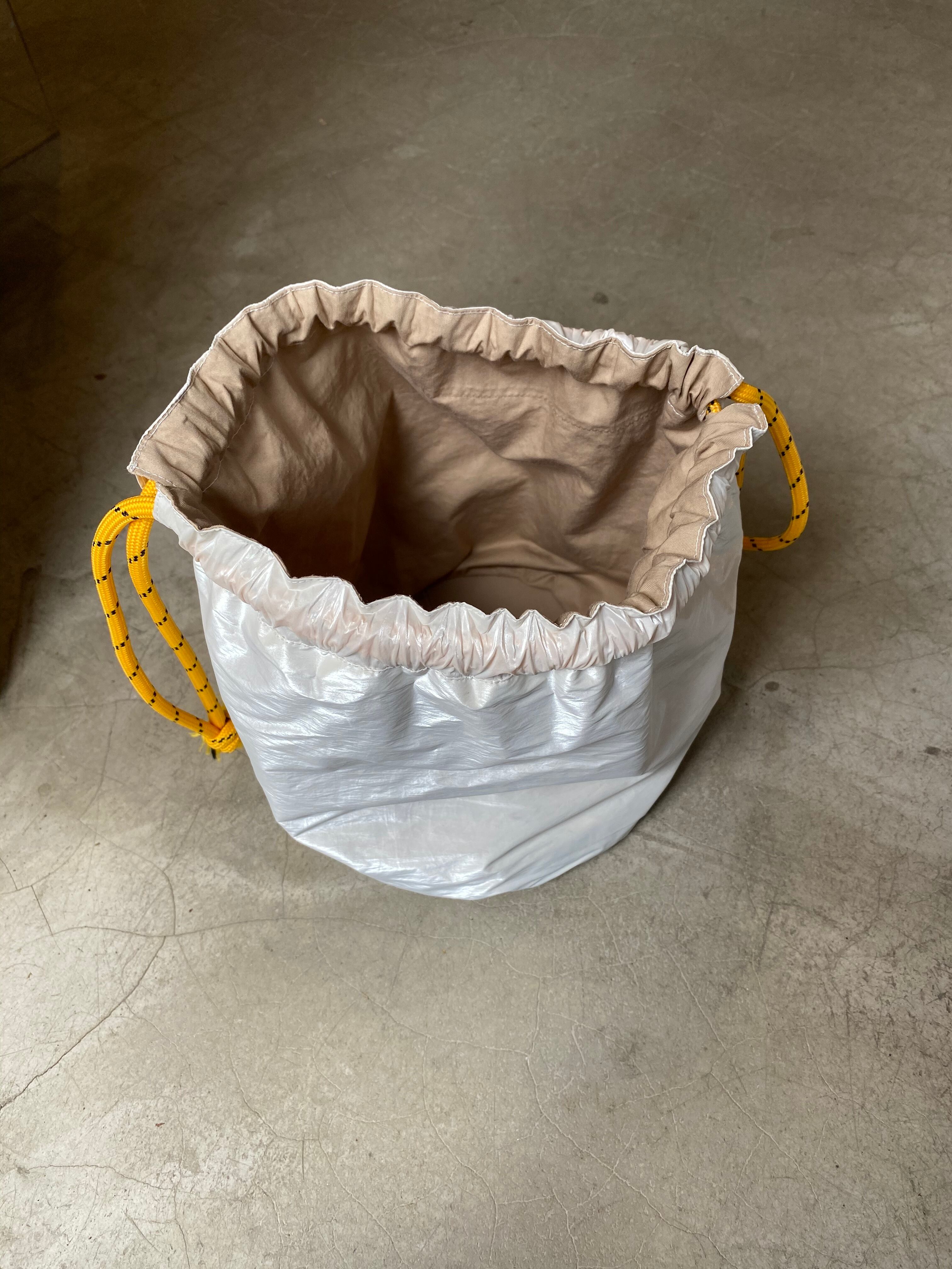 シャイニーな素材×アウトドアのストリングが可愛い、アイロニムオリジナルの巾着バッグ。